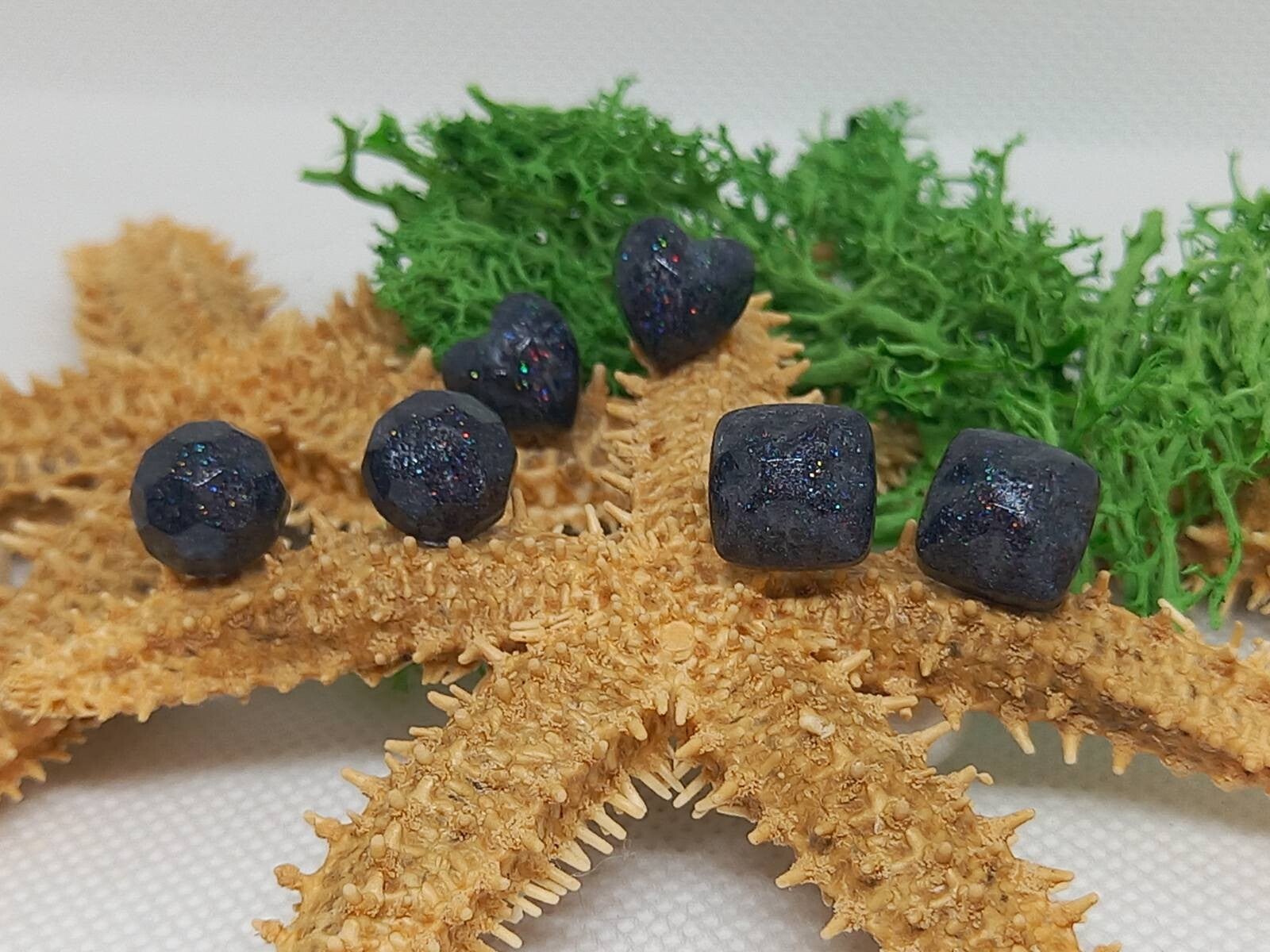 Un ensemble unique de boucles d'oreilles en résine UV faites à la main inspirées de la beauté du ciel nocturne et du cosmos scintillant. L'ensemble comprend trois paires de boucles d'oreilles de formes différentes : gouttes facettées, cœurs soignés et cubes minimalistes - chaque paire avec des paillettes scintillantes imitant la poussière d'étoiles sur un fond noir profond.