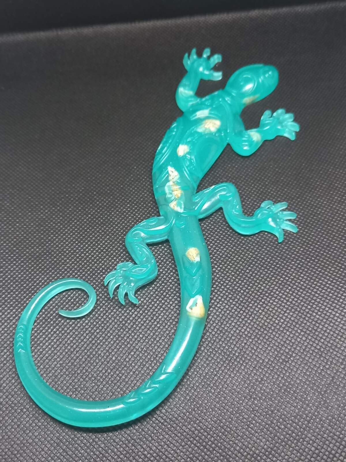 Une figurine de lézard décorative unique, fabriquée à la main en résine époxy transparente aigue-marine.