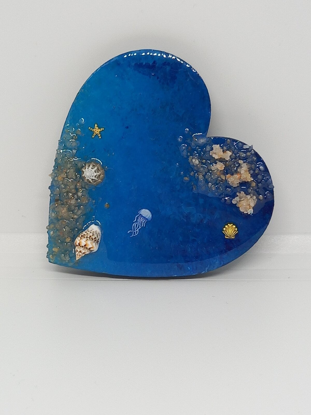Magnifique magnet en forme de cœur, réalisé sur une base en bois et recouvert de résine UV. À l’intérieur, un véritable petit coin de mer : sable naturel, mini coquillages et éléments marins décoratifs. La couleur bleue intense et ses reflets donnent une impression de profondeur marine.