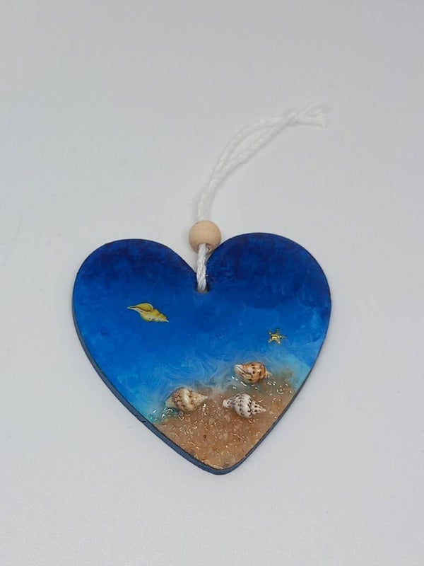 Une pièce artisanale unique en forme de cœur. Fabriquée en bois et recouverte de résine UV avec un effet de vagues marines. Des éléments décoratifs tels que de petites coquilles, du sable et des paillettes complètent la composition. Parfaite pour la décoration intérieure, comme cadeau ou élément de déco original.