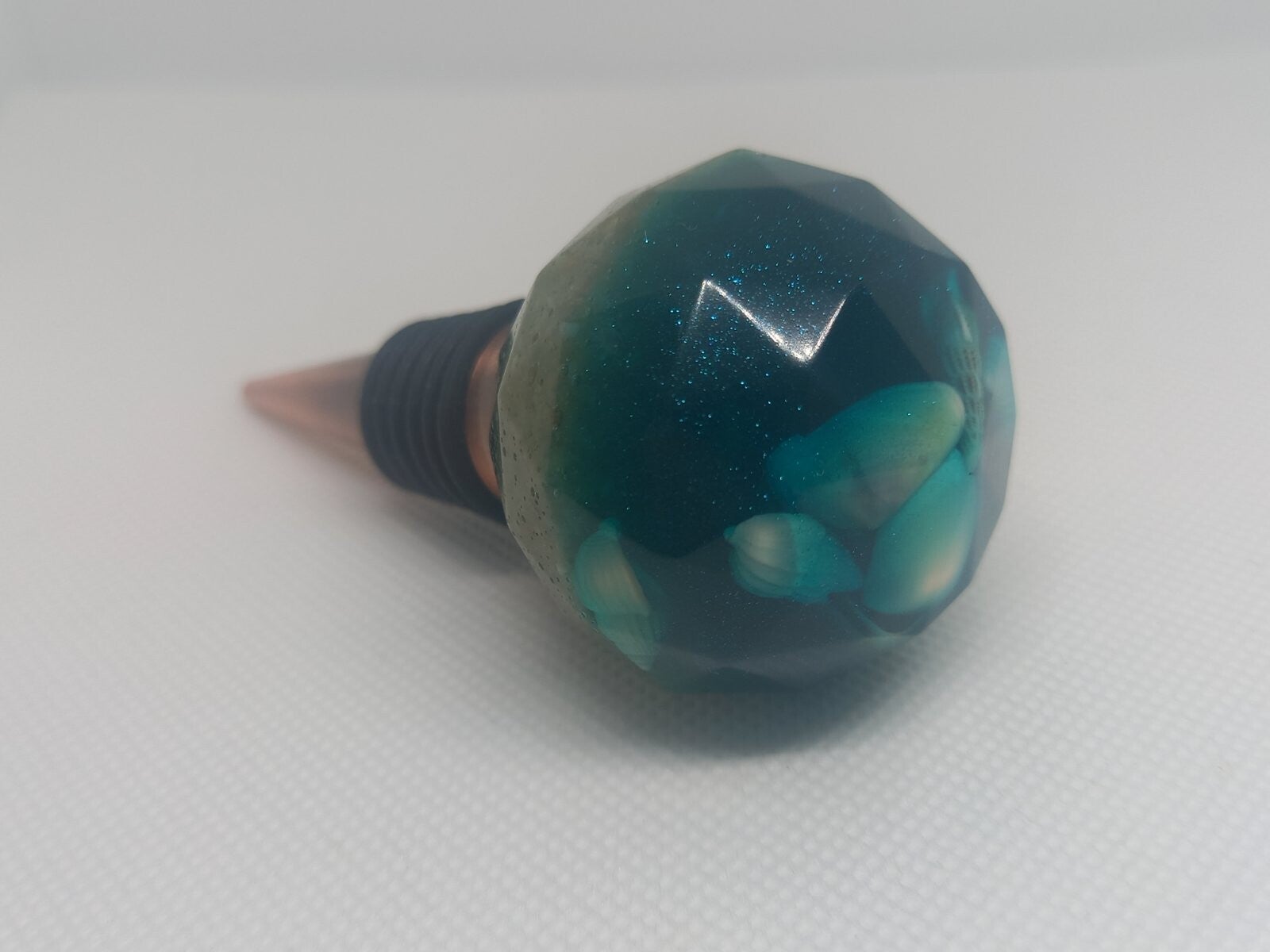 Bouchon de bouteille en résine époxy avec des coquillages naturels Bouchon original fait main en résine époxy transparente, contenant de véritables coquillages marins. Sa teinte vert émeraude profonde et sa forme taillée en facettes lui confèrent un style élégant et marin. Idéal pour sublimer une bouteille de vin, décorer une table ou offrir en cadeau. Matériaux : résine époxy, coquillages naturels, métal Couleur : vert émeraude avec effet nacré Taille standard pour bouteilles de vin et autres Pièce artisanale unique